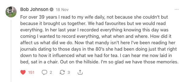 the reading journal was borne out of reclaiming my love for reading; the desire to engage with it more deeply and thoughtfully than ever before. it’s a practice introduced to me by my favourite lecturer from my first year at university studying english literature. it’s also a practice which i immediately abandoned as soon as it was no longer required. although it took me a long time to return to, it now feels second nature, an essential facet to my reading that is not simply a habit to keep up. it is a record of the impressions which literature indelibly leaves on me. and as this very touching comment from Bob Johnson on my note about my reading journals reminds us - our journals are also proof of our existence.