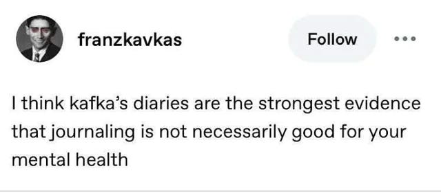 if i can, i hope to simply inspire you to try journalling yourself in a way that feels open and exciting to you. to write without concern for external measurements and outcomes. reducing journalling to these would be the death of it and therefore the death of developing an intimate relationship to yourself (whatever that may be). anais nin, sylvia plath and franz kafka wrote journals for diverse and uniquely personal reasons - but i am confident that none of them were self improvement.